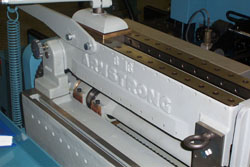 Armstrong stretcher rolls are available in either a Super Duty or Standard Duty configuration. The Super Duty configuration allows saws to be rolled harder and faster with less tendency to "dish" the saws. Parts last longer and, when they eventually wear, the parts are easily replaced. Standard duty machines can be rebuilt and upgraded at the Armstrong factory to Super Duty configuration in one week at a significant savings over buying a brand new machine. The Super Duty version is especially recommended for high volume sawmill filing rooms and all saw repair shops and band saw factories. Saw filers should expect their rolls to last up to 50% longer between regrindings. When rolls must be changed, it typically takes only half as long to replace the rolls in a Super Duty machine. All Armstrong stretcher rolls feature a free-standing adjustable height base which supports the roll from 36" to 60" (915 to 1525 mm) high. The adjustable height feature allows the filer to set the roll to the proper height for his saws and matches the adjustability of the No. 81 Armstrong band saw benches. The Super Duty Stretcher Roll includes hardened steel wear strips and replaceable micarta shoes on the bearing housings. The nylon washers that center the stretcher rolls between the bearing blocks on standard duty machines are replaced with thrust bearings on the Super Duty model. Armstrong stretcher rolls are available in three sizes for band saws up to 12", 14" and 16" widths. Only the bottom roll is powered. Components to power the top roll are available at additional cost.